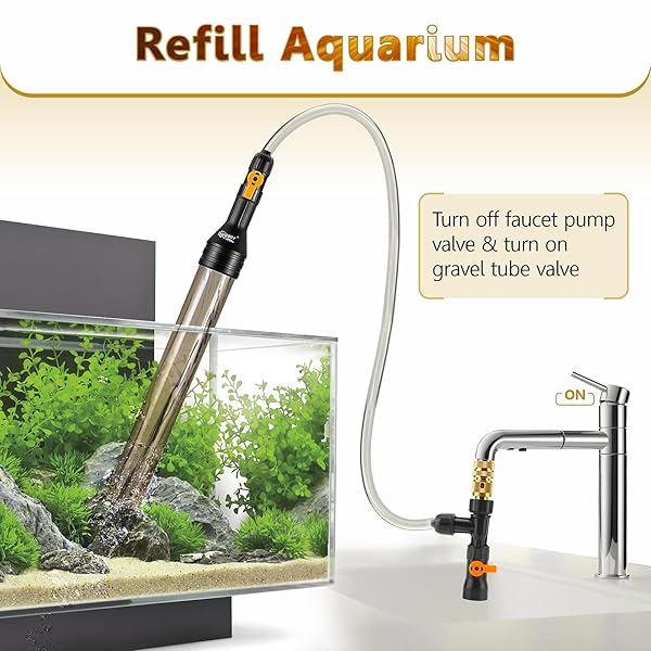 - hygger Bucket-Free Aquarium Water Change Kit Metal Faucet Connector Fish Tank Vacuum Siphon Gravel Cleaner with Long Hose 33FT Drain & Fill offers reliable performance and quality- Upgrade Metal Brass Sink Connector: build to last long term use. hygger Bucket-Free Water Change Kit makes aquarium maintenance work a breeze, saving lots of time and energy on cleaning the mess caused by carrying bucket back and forth, easy to assemble and use
