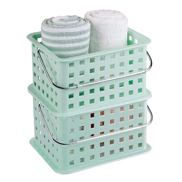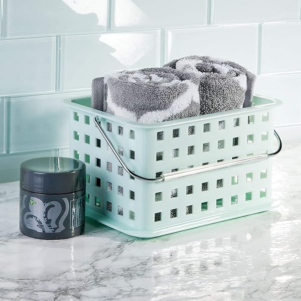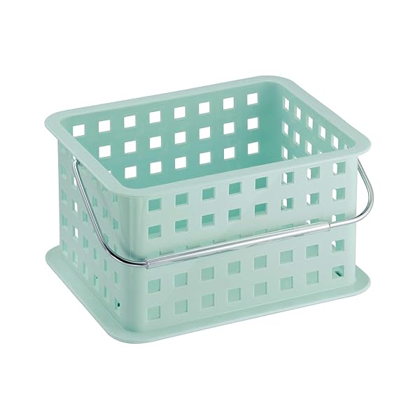 * iDesign Spa BPA-Free Plastic Small Stackable Basket with Handle - 9.25" x 7" x 5", Mint: the interdesign small basket is great for extra storage and organization anywhere in the home * Includes a chrome handle for portability and it's stackable to maximize your storage space * SMALL BATHROOM ORGANIZER BASKET: Provides storage for smaller items such as makeup * Cosmetics * Brushes