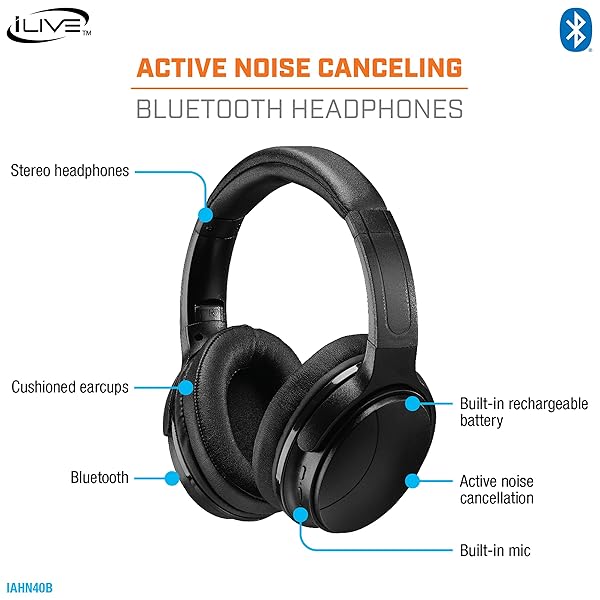 iLive Active Noise Cancellation Bluetooth Headphones, Adjustable Headband, Includes 3.5mm Audio Cable, Black (IAHN40B)