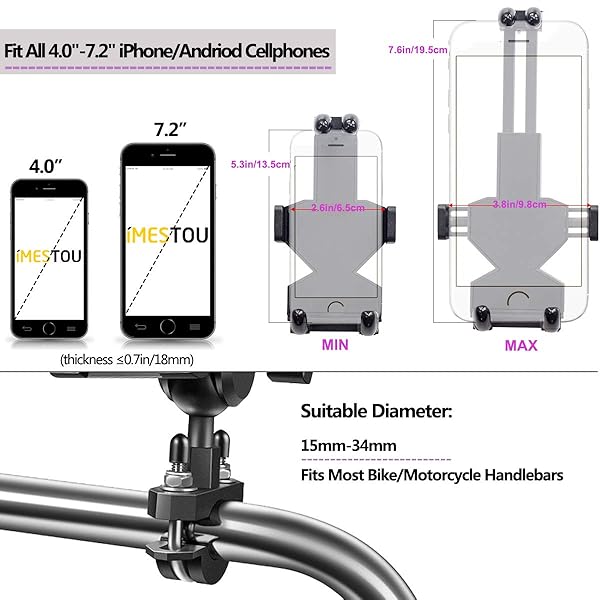 - iMESTOU Aluminium Motorcycle Phone Mount U-Bolt Handlebar 1" Ball Stem Cellphone Holder 360 Rotating with Length Width Adjustable Universal for Max.7.2 inch Large Phones Sturdily offers reliable performance and quality