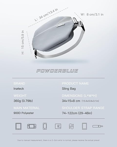 - Inateck Sling Bag X, Multi-pocket Crossbody Shoulder Chest Bag with Adjustable Shoulder Strap, Water-resistant Waist Fanny Pack for Men, Women, Travel, Daily Use, Cycling, Hiking, Gray Blue, Large with reliable performance and quality- Compact Yet Spacious: The outer dimensions of this bag is 34 x 15 x 8 cm (13.4 x 5.9 x 3.1 inch). The front section of the main compartment features a zippered pocket and double-layered 2-grid pockets, while the rear section serves as an electronics