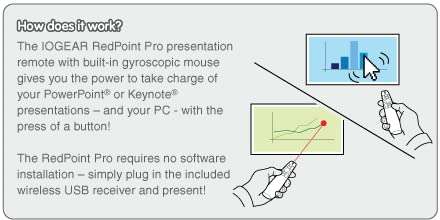 * IOGEAR Red Point Pro 2.4GHz Gyroscopic Presentation Mouse with Laser Pointer, GME430R: control your powerpoint and keynote presentations like never before! the iogear repoint pro presentation remote with built-in gyroscopic mouse gives you the power to take charge of your powerpoint or keynote presentations * And your PC * With the press of a button * Works for Windows and Mac * No Software Installation needed! The IOGEAR Repoint Pro is designed to work with the latest versions of Windows and