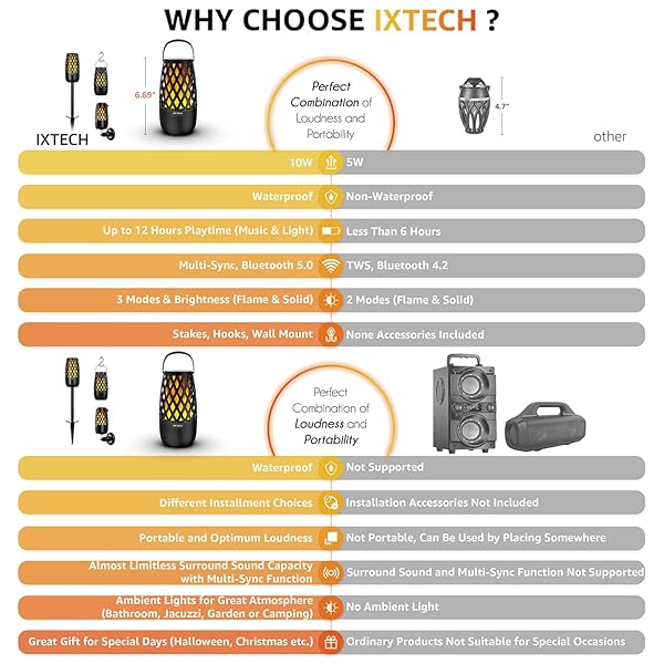 - IXTECH Outdoor Bluetooth Speaker Waterproof Wireless Portable Speaker with LED Flame Lights Linkable Torch Lantern for Party Pool Camping Halloween Christmas Birthday Gift 2 Pack with reliable performance and quality- Premium LED Bluetooth Speaker upgraded to perfection - Designed like a small tiki torch, this wireless Bluetooth speaker produces crisp, clear, illuminating sound at 360, providing a relaxing and restorative music listening experience that is sure to enhance your spa