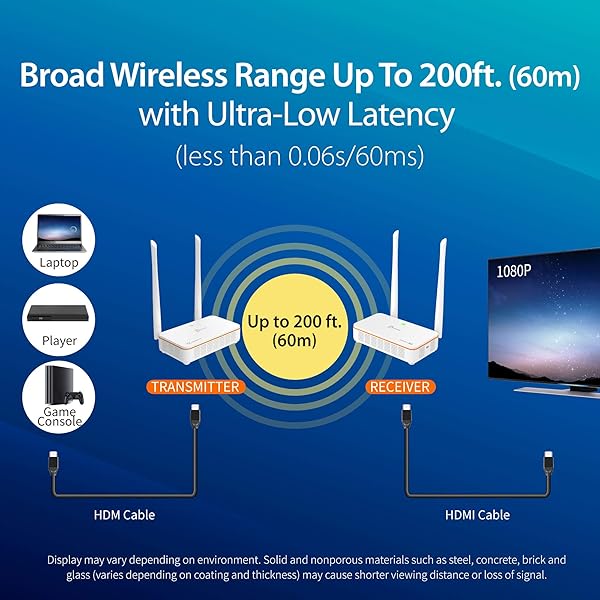 * j5create Wireless Display HDMI Extender Full HD 1080p 60fps Transmitter and Receiver with 200ft Transmission, Ultra-Low Latency, for Home/Office/Church (JVAW53): the jvaw53 hdmi over wireless extender includes a transmitter and receiver kit * It can send a high definition video and audio signal to an HDMI enabled TV set * Projector or LCD PC monitor display device with receiver distance up to 60 meters and nearly zero latency * Wireless: Stable connection * High quality