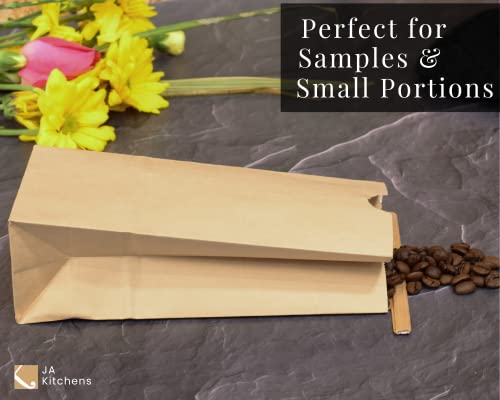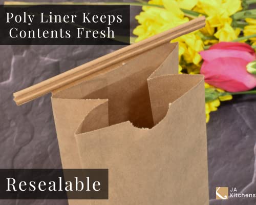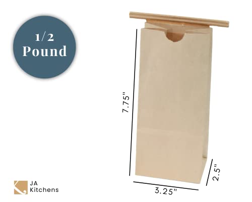 - JA Kitchens 1/2 Pound Kraft Coffee Bags - 50 Count - Brown offers reliable performance and quality- Bulk package of 50 empty Kraft Tin Tie Coffee Bags boast poly liner for freshness and flavor preservation- Resealable paper bags are easily customizable for your coffee shop, cafe, deli, grocery store, or party- Each bag boasts 1/2 pound / 8 oz capacity and measures 3.25" x 7.75" x 2.5". Perfect for sending bakery treats or party favors home with guests