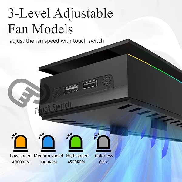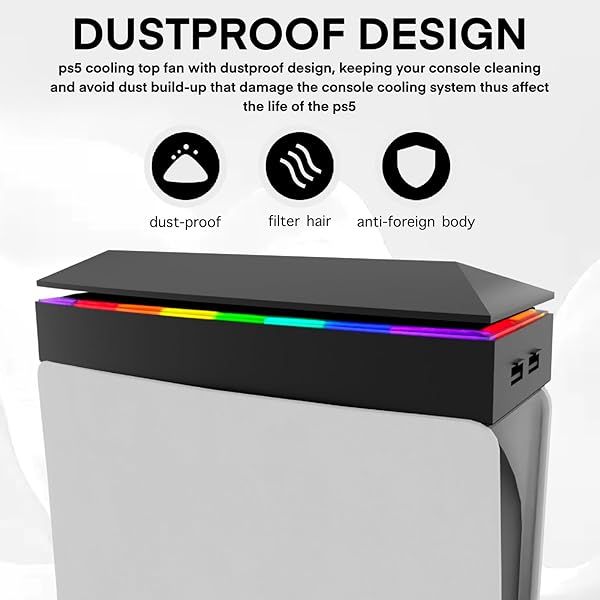 - JDGPOKOO Dustproof PS5 Cooling Fan, PS5 Fan with 7 Modes RGB Light, Low Noise Cooler for PlayStation 5 Digital & Disc Edition, 3 Speed 4000/4200/4500RPM, Independent Touch Switch, 2 USB Port (Black) with reliable performance and quality- Design for ps5 Cooling fan for ps5 accessories integrates many functions in 1. Top cooling fan with dust-proof design, 3 gears cooling system, 7-modes RGB color light strip, extra 2 usb ports. These features not only extend the life of the console