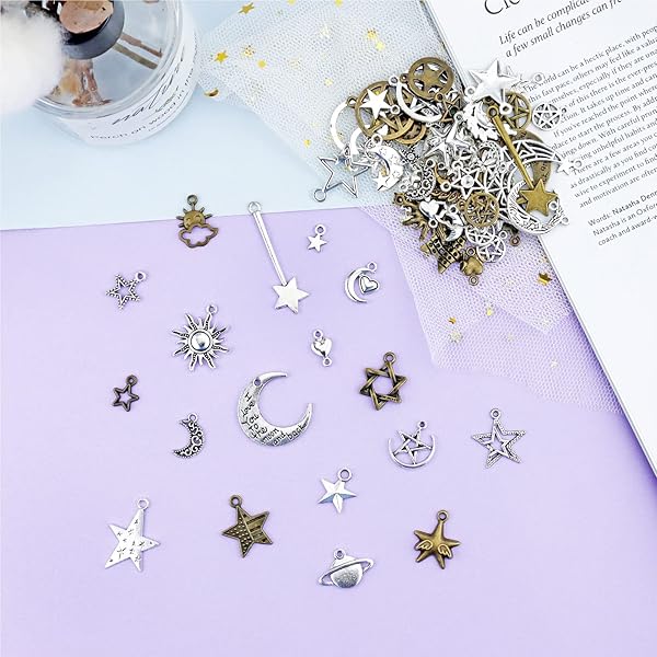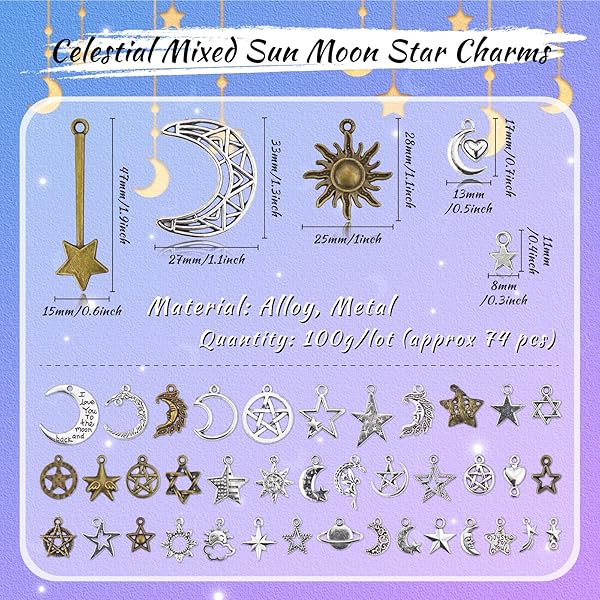 - JIALEEY Celestial Mixed Sun Moon Star Charms, Wholesale Bulk Lots Antique Alloy Charms Pendants DIY for Necklace Bracelet Jewelry Making and Crafting, 100g(74PCS) offers reliable performance and quality- Material: Alloy, Metal- Quantity: 100g/lot (approx 74 pcs). Size: 0.6 - 1.9 inch (1.5 - 4.8 cm)- Exquisite and classical design charms.It can be used in all kinds of decoration