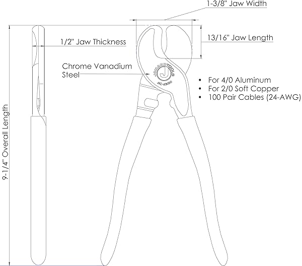 - Jonard Tools JIC-63050 High Leverage Cable Cutter - Chrome Vanadium Steel, Induction-Hardened Edges, Cuts Aluminum, Copper & 100-Pair 24 AWG Cable, Ergonomic Grip, 13/16 Jaw Opening (Color May Vary...- HIGH LEVERAGE DESIGN: Handles are flared outward for superior leverage and cutting ability- SHEAR-TYPE JAW: Designed with a shear-type jaw for cutting aluminum and soft copper- LARGE CABLE CUTTER: Cuts up to 100-pair 24 AWG cables