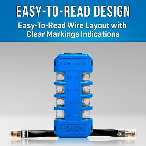 - Jonard Tools BAN-800 RJ45 8-Position Modular Adapter, Test RJ11, RJ12, and RJ45 Plugs with reliable performance and quality- SECURE CONNECTION: The holed copper contacts ensure a reliable and stable connection with alligator clips during testing, preventing any accidental disconnections and providing precise and consistent results- EASY-TO-READ: Wire layout features labeled markings indicating the different wire positions, making it effortless for network technicians to ide