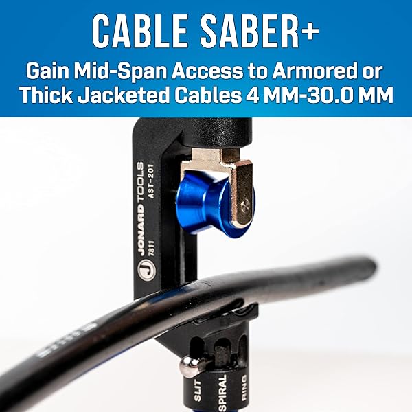 - Jonard Tools AST-210 CableSaber+ Armored Mid Span Cable Slit & Ring Tool - for 144F-1728 RocketRibbon Cables (4mm-30mm) with reliable performance and quality- CABLE SABER: The ultimate tool for gaining mid-span access to armored or thick jacketed cables 4 mm-30.0 mm (0.157-1.181) in diameter, such as Corning's 1728 RocketRibbon cable- UTLRA-SHARP STEEL BLADE: Cuts through the toughest materials with ease, including thick jacketed and armored fiber optic cables, with an adju
