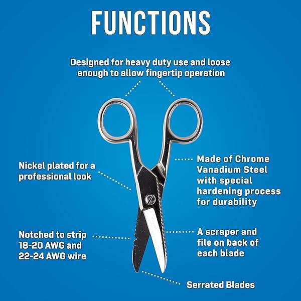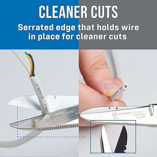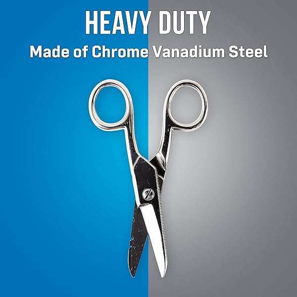 - Jonard Tools ES-1964 Stainless Steel Electrician Scissors, for Heavy Duty Use provides reliable performance and quality- HEAVY DUTY: Designed for heavy duty use, these electricians scissors are made of chrome vanadium steel and reinforced with a special hardening process for greater durability and cutting performance- CLEANER CUTS: One blade has a serrated edge that holds wire in place for cleaner cuts