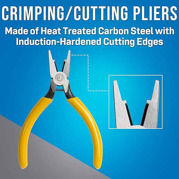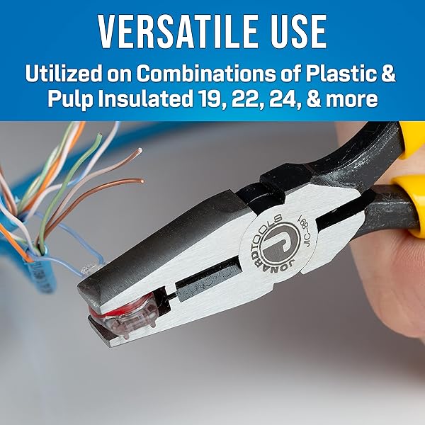 - Jonard Tools JIC-891 Connector Crimping Plier with Side Cutter, 5-13/16" Length,Yellow provides reliable performance and quality- PREMIUM MATERIAL: Crafted from heat-treated carbon steel, these pliers boast induction-hardened cutting edges that provide exceptional strength and long-lasting durability- VERSATILE FUNCTIONALITY: Specifically designed for multiple tasks, these pliers can effectively press UR/UY/UG, 709 series, "B" type, and AMP Tel-Splice connectors