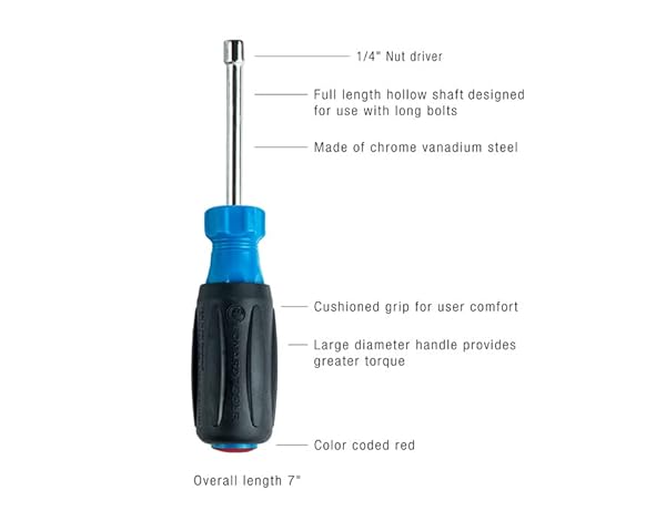 - Jonard Tools ND-63014, Nut Driver, 1/4" Hex Tip, 3" Hollow Shaft with Wide Ergonomic Comfort Grip provides reliable performance and quality- IDEAL FOR LONG BOLTS: Nut driver has a full length hollow shaft for working with stacked circuit boards and long bolts/studs- GREATER COMFORT AND TORQUE: Handle is ergonomically designed with thermoplastic rubberized grip