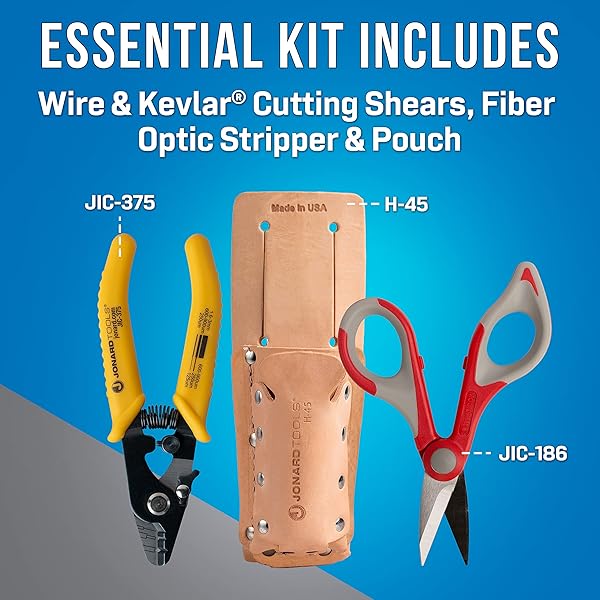 * Jonard Tools TK-355 3 Hole Fiber Stripper & Kevlar Shears Scissor Kit, Leather Pouch: featuring our best selling jic-186 wire & kevlar cutting shears and jic-375 three hole fiber optic stripper in a convenient leather pouch * The TK-355 Fiber Stripper & Kevlar Shears Kit is the essential tool kit for any fiber technician * This kit features the following: * JIC-375 strips the 1.6 mm-3 mm fiber jacket * 600-900 micron buffer coating