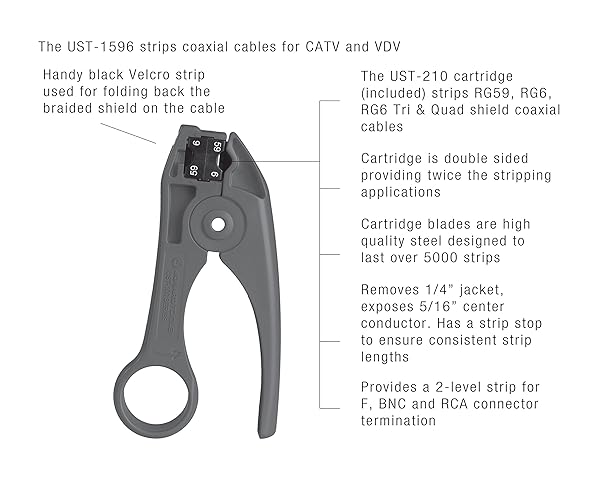 - Jonard Tools UST-1596 Coaxial Cable Stripper for RG59 and RG6 Coax Cable provides reliable performance and quality- RG59/6 STRIPPING: Designed to strip RG59, RG6, N48, RG6 Tri & Quad Shield Coaxial Cables for quick and easy termination- INCLUDED BLADE CARTRIDGE: UST-210 provides a 2-level strip for F, BNC, and RCA connector termination- DOUBLE-SIDED: Double sided cartridge provides twice the stripping applications before requiring replacement