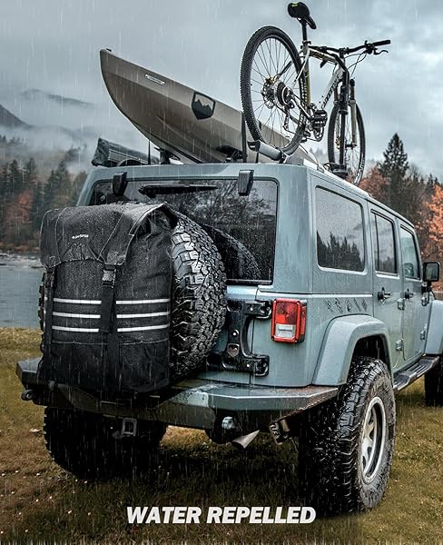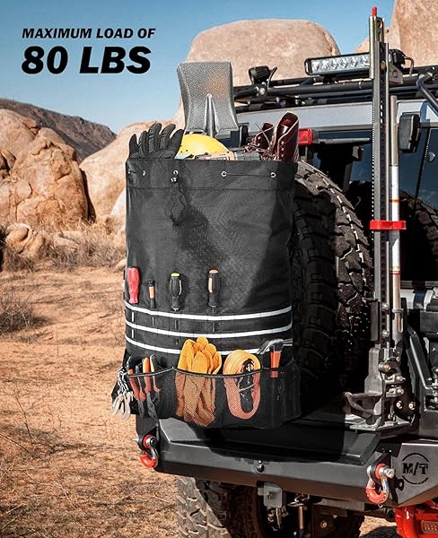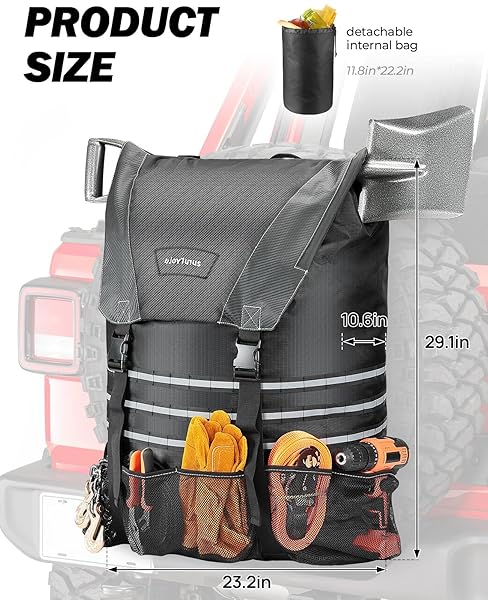 - JOYTUTUS Spare Tire Trash Bag, Fits 40" Tire 31 Gallons Overland Series Larger Capacity Cargo Spare Tire Storage Bag for 4x4 Off-Road Camping Recovery Gear Firewood for Wrangler JK JL offers reliable performance and quality- Universal Fit: Universal X-Strap design and fitment for tires from 30 to 40'' at/mt, compatible with wrangler, bronco, truck, suv or sedan. Spare tire trach bag is about 31" x 21" x 9", please check the size before ordering