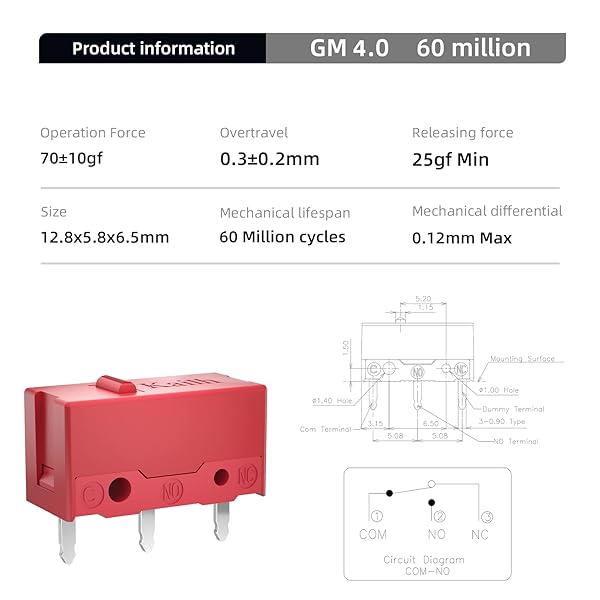- KAILH GM4.0 GM8.0 Micro Switch 60M 80MLife Gaming Mouse Micro Switch 3 Pin Black Mice Left Right Button GM 4.0 8.0 (Red 4pcs GM4.0) with reliable performance and quality- GM 8.0 Releasing force 25gf(min), Operating force 6510gf, Conduction itinerary 0.30.2mm, Touch feeling 25%.Gold plated contacts.- GM 4.0 Releasing force 25gf(min), Operating force 7010gf, Conduction itinerary 0.3mm, Touch feeling 25%. Not silent micro switch.No double click.- GM8.0 with 80000000 cyc
