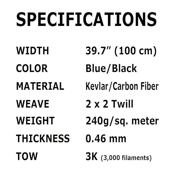 - KARBXON - 1M Wide (39.8in) Carbon Fiber Aramid Fabric - Blue - 3K - 240g/m - Twill Weave - Advanced Fiber Cloth - Wide Hemmed for Repair, DIY offers reliable performance and quality- Advanced technology Carbon Fiber cloth carbon nano tubes. Harness the strength of carbon atoms bonded together in a helical structure- 3K TOW (3000 nano tubes per weave)- 240 grams (8.4oz) per square meter fabric weight
