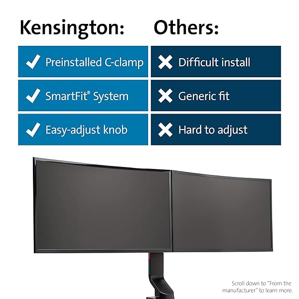 * Kensington Dual Monitor Mount for Desk, C-clamp Vesa Monitor Stand Fits 2 Ultrawide Monitors Up to 27 Inches, Low Profile Stand, Height Adjustable Rotating Free Standing Arm, Black: finding the correct ergonomic monitor adjustment is easy even for desks with a shallow depth or in tight spaces with the smartfit space-saving dual monitor arm * Designed with wellness and ergonomics in mind * Its easily adjustable and keeps your monitor at eye level * Works great for sit-stand desks * Adjust the
