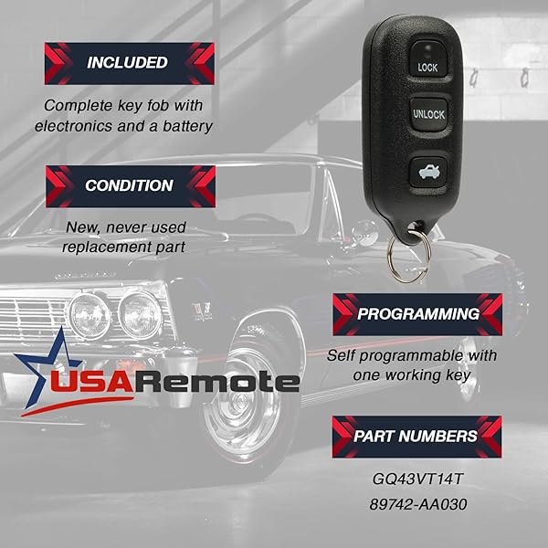 - Key Fob fits 2002-2006 Toyota Camry / 2002-2003 Toyota Solara Keyless Entry Remote (GQ43VT14T) offers reliable performance and quality- Included: Complete key fob with electronics and a battery- Replaces P/N: 89742-AA030- For FCC ID: GQ43VT14T- Programming: Self programmable with one working key