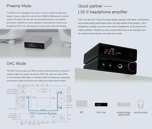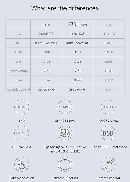 - Topping E30II lite DAC Preamp - AK4493S Hi-Res XMOS XU208 DAC 32Bit/768kHz DSD512 DSD Direct Mode for USB/Coax/Opt Inputs RCA HiFi Stereo Digital Audio Decoder(Silver) with reliable performance and quality- Supports high-resolution audio The E30 II lite uses AKM's VELVET Sound technology's sub-flagship AK4493S chip. It has won wide acclaim from audio enthusiasts for its outstanding performance and top-notch sound quality. With the AK4493S, the E30 II lite has a dynamic range of up
