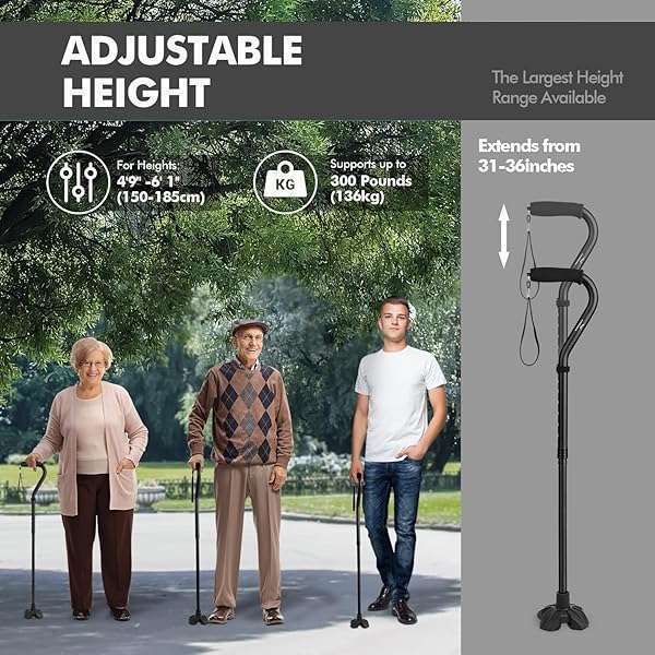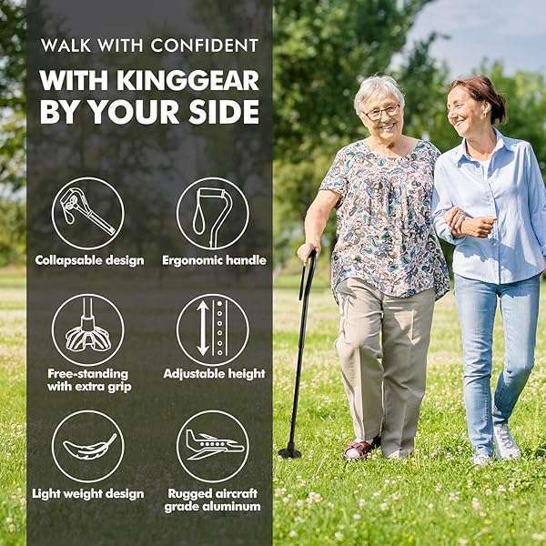 - KINGGEAR F1 Walking Stick, Walking Cane for Women & Men, Self Standing Walkers for Seniors with Wrist Strap, Lightweight & Sturdy Offset EVA Handle and Large Quad Base offers reliable performance and quality