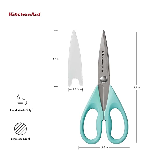 - KitchenAid All Purpose Kitchen Shears with Protective Sheath Durable Stainless Steel Scissors, Dishwasher Safe, Soft Grip Comfort Handle, 8.72 Inch, Aqua Sky offers reliable performance and quality- PREMIUM STAINLESS STEEL BLADES: Built to resist rust and maintain sharpness, these stainless steel blades easily cut through everyday kitchen items like vegetables, herbs, meat, and packaging with clean, precise cuts