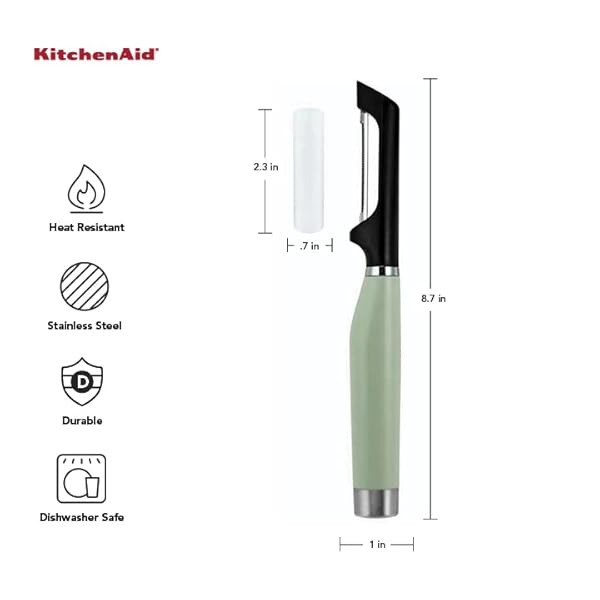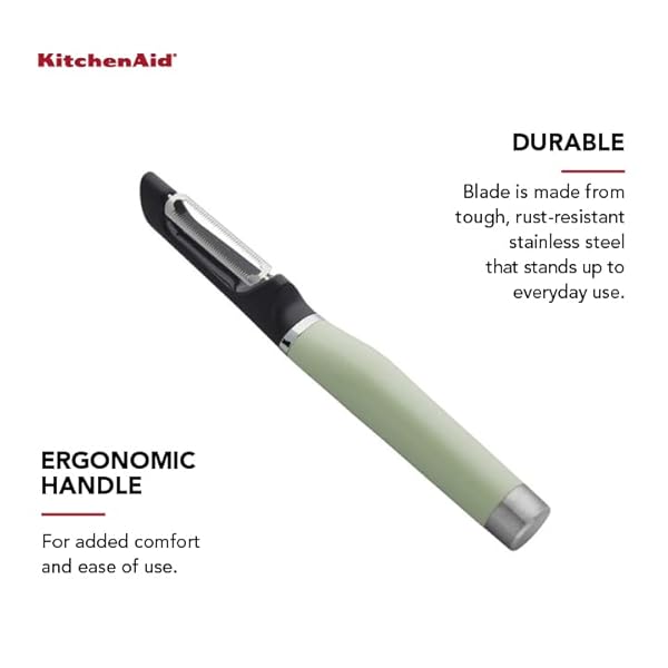 - KitchenAid Gourmet Euro Peeler, 8.7-Inch, Pistachio offers reliable performance and quality- DOUBLE EDGE SERRATED BLADE : This Euro Peeler features a double edged serrated blade constructed of tough, rust-resistant 420 stainless steel. It is perfect for peeling all fruits and vegetables, including soft skin foods- BUILT IN POTATO EYER: Sharp eyer easily removes blemishes in one scoop
