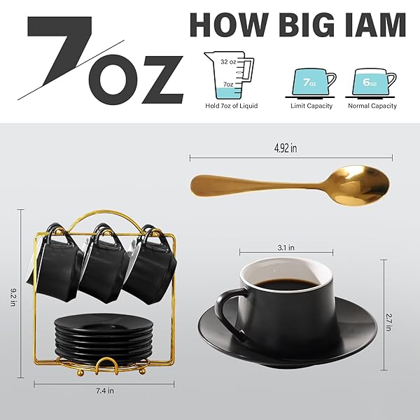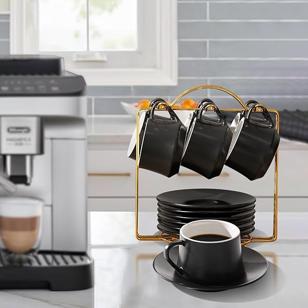 - Lareina 7-Ounce Porcelain Cappuccino Cups Set of 6, Stackable Coffee Cups with Saucers, Spoons and Metal Stand-for Specialty Coffee Drinks, Cappuccino, Latte, Americano and Tea, Black offers reliable performance and quality
