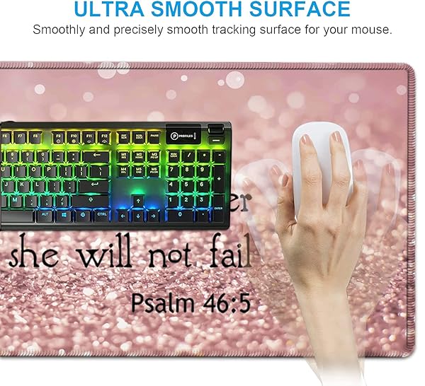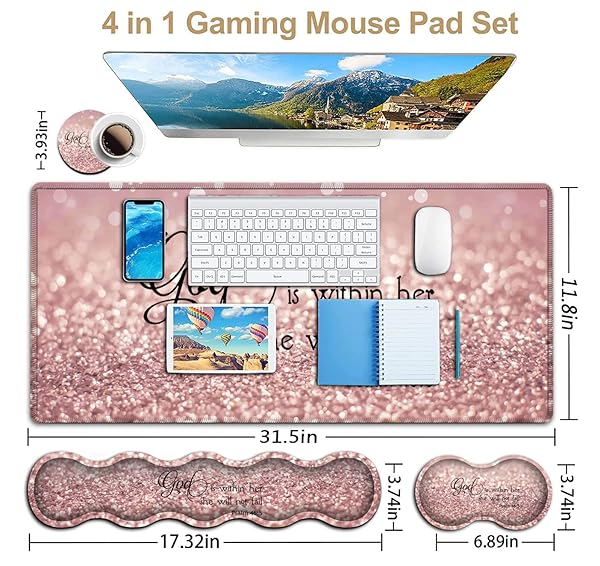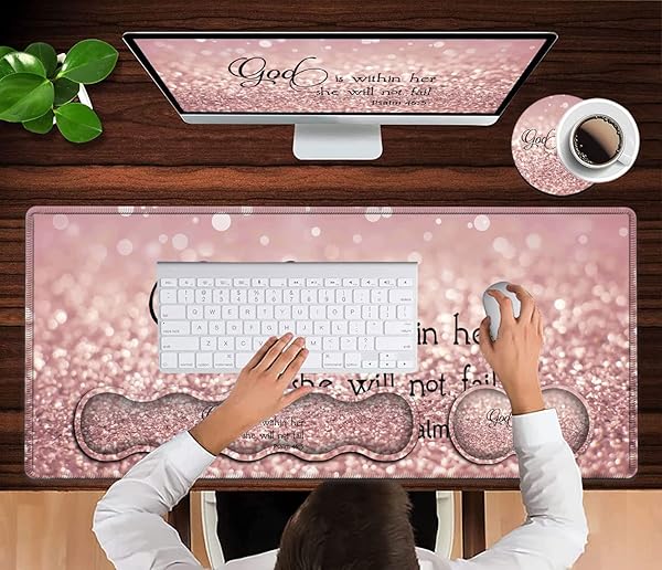 - Large Mouse Pad, Desk Mat, Keyboard Pad+ Ergonomic Keyboard Wrist Rest Set,Extended Laptop Protector Writing Mat for Home Office Desktop, Psalm 46:5 Pink Gaming Mouse Pad Office Desk Pad Wrist Rest with reliable performance and quality- Super Good Deal SetErgonomic mouse pad includes desk pad (31.5x11.8inch), keyboard wrist rest(17.3x3.74inch), mouse wrist rest(3.74x6.9inch), cup coaster(3.9x3.9inch).No need to buy separately. This desk pad for keyboard and mouse, is large enough