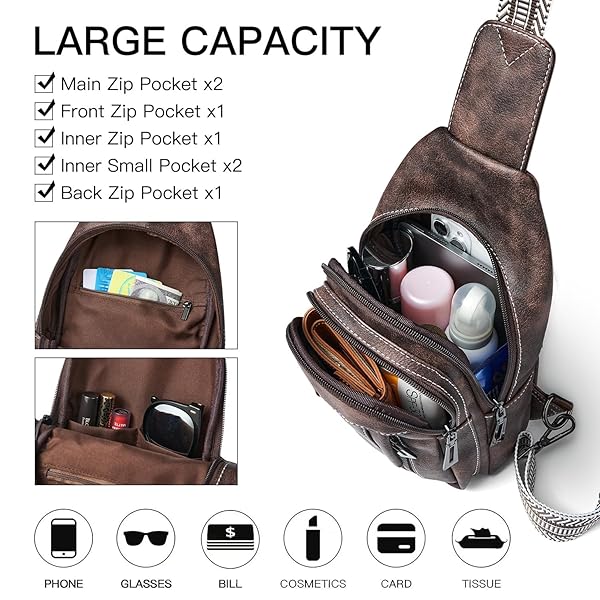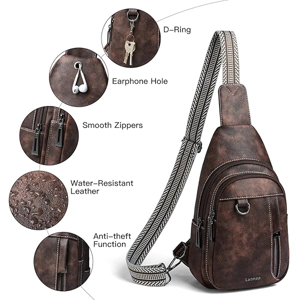 - LATMAP 7L Sling Bag for Women Men Leather Small Sling Backpack Daypack Anti Theft Fanny Pack Crossbody Purse Travel,COFFEE offers reliable performance and quality- Premium Material: Our new cross body bag for woman is made of premium faux leather, the chest pack's body and shoulder straps are reinforced with sturdy stitching for durability.An earphone hole on the back pocket enables you to enjoy music easily