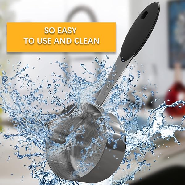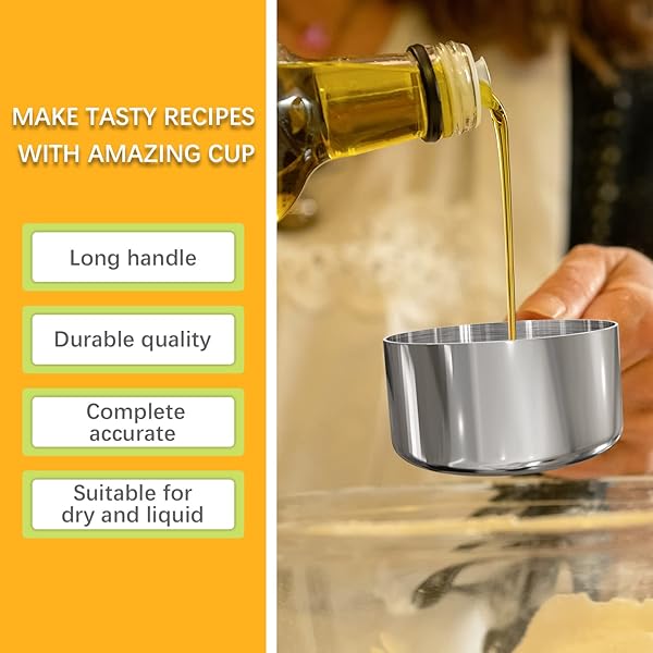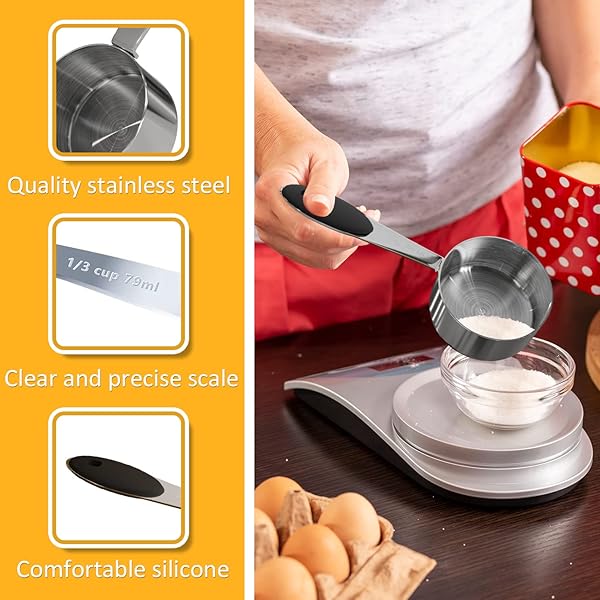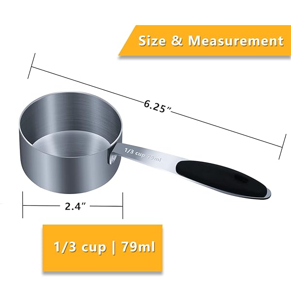 - LEIFENY 1PCS 1/3Cup (79ml, 2.7oz) Single Measuring Cup with Black Silicone Grip, Stainless Steel Individual Measure Scoop Only offers reliable performance and quality- Sturdy & Durable The measuring cup is made of highly stainless steel which will never rust! Its well-crafted and durable, easy to clean, and dishwasher safe