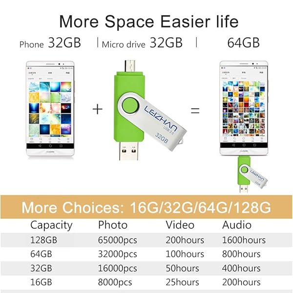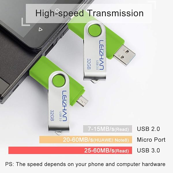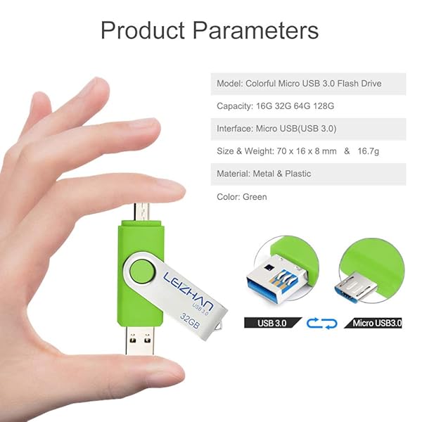 - leizhan Thumb Drive 64 gb High Speed USB Flash Drive 3.0 for Samsung Galaxy S7/S6/S5/S4/S3/Note5/4/3/2/A7, Micro-USB 3.0 Memory Stick, Green offers reliable performance and quality- 64GB USB OTG Flash Drive.2 in 1 Micro USB and USB 3.0 connectors for easily transfer content between OTG enabled Android smartphones, tablets, computers