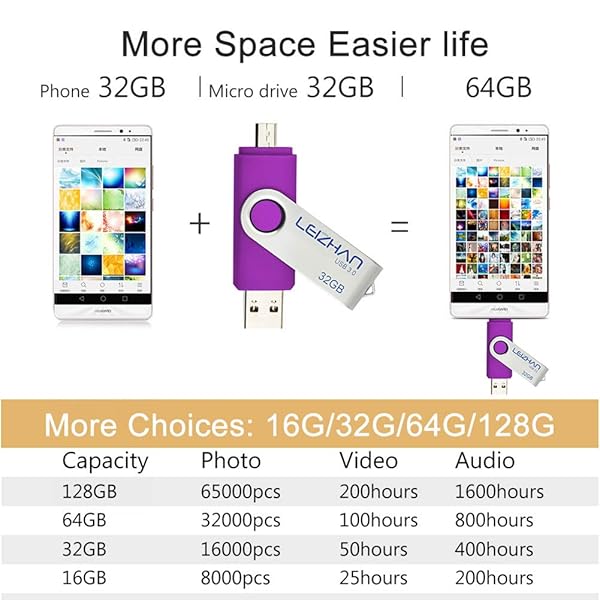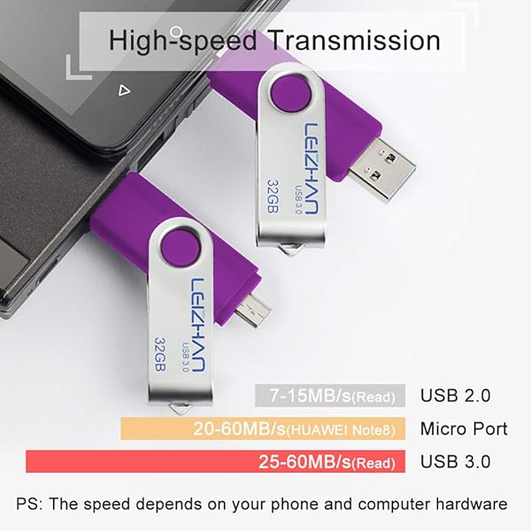 - leizhan 64 GB Micro USB Flash Drive 3.0 OTG Memory Stick for Android Phones Micro Devices and Computers, Micro-USB 3.0 Thumb Drive, Purple offers reliable performance and quality- 64GB USB OTG Flash Drive.2 in 1 Micro USB and USB 3.0 connectors for easily transfer content between OTG enabled Android smartphones, tablets, computers- This micro phone memory stick works on micro USB smartphones with D shaped port. Note: Only support smartphones which has OTG function