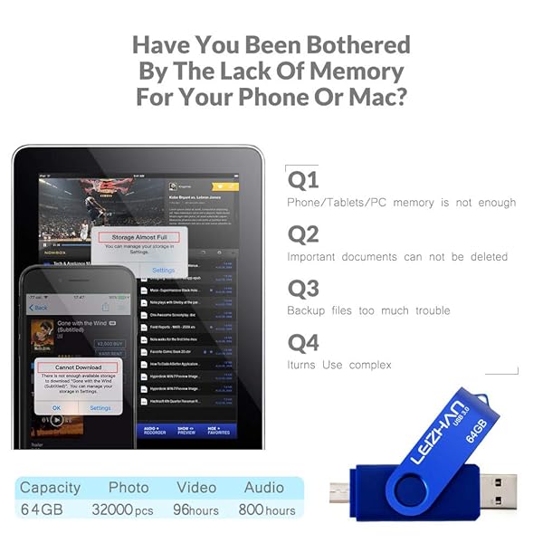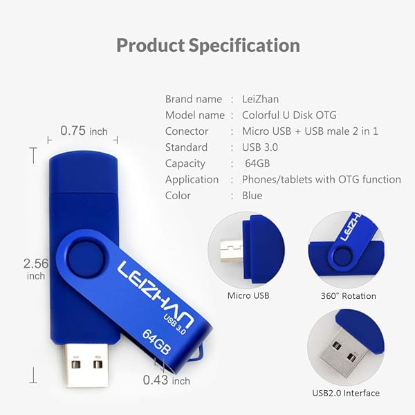 - USB 3.0 OTG Flash Drive, leizhan 64GB Micro USB Memory Stick for Samsung Galaxy S4 S5 S6 S7 HTC Nokia Moto Huawei, Blue offers reliable performance and quality- 64GB USB OTG Flash Drive.2 in 1 Micro USB and USB 3.0 connectors for easily transfer content between OTG enabled Android smartphones, tablets, computers
