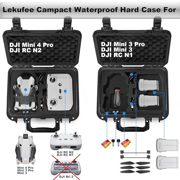 - Lekufee Travel Waterproof Hard Case for DJI Mini 4 Pro/3 Pro/3 Drone & RC N3/N2/N1 and Accessories (Case Only) with reliable performance and quality- Custom DesignThe Lekufee waterproof case includes custom foam is designed for DJI Mini 4 Pro/DJI Mini 3 Pro/Mini 3 Drone. Can hold: 1x DJI Mini 4 Pro Drone, 3x DJI Mini 4 Pro Battery Plus [Include Drone's Inner Battery], 1x DJI RC-N2 [ONLY], 2x MicroSD Card, 3x RC Cable, 2x DJI Mini 4 Pro Propellers (Pair) and 2x DJI RC-N2 Control St