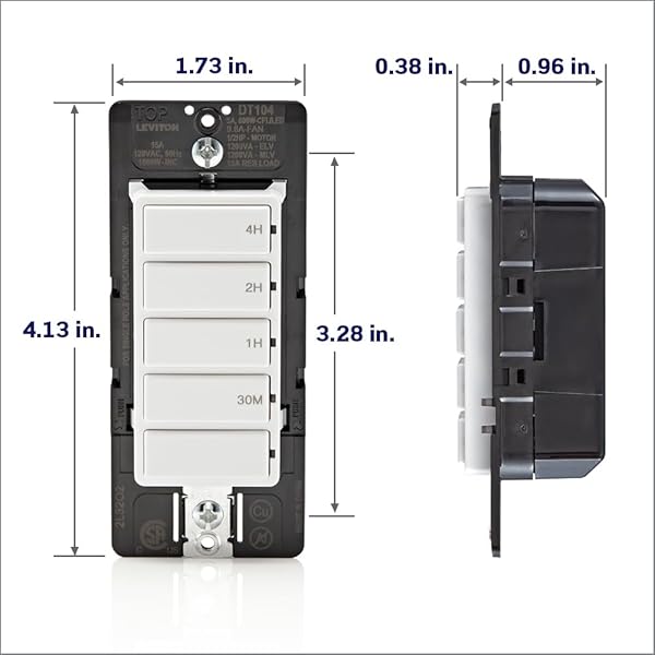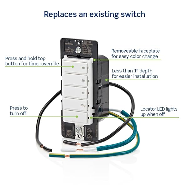 - Leviton Countdown Timer Switch for household lights, heaters and exhaust fans, 30 min, 1-2-4 hour, No Neutral Wire Required, Single Pole, 15A, 1/2 HP/9.8A Fan/Motor, DT104-1LW, White with reliable performance and quality- PRACTICAL Ideal to use for porch and landscape lighting, interior lights, ventilation fans, heat lamps, hot tubs, saunas, attic fans and more- High performance for daily use- Durable build for long term reliability- Easy to use and maintain<