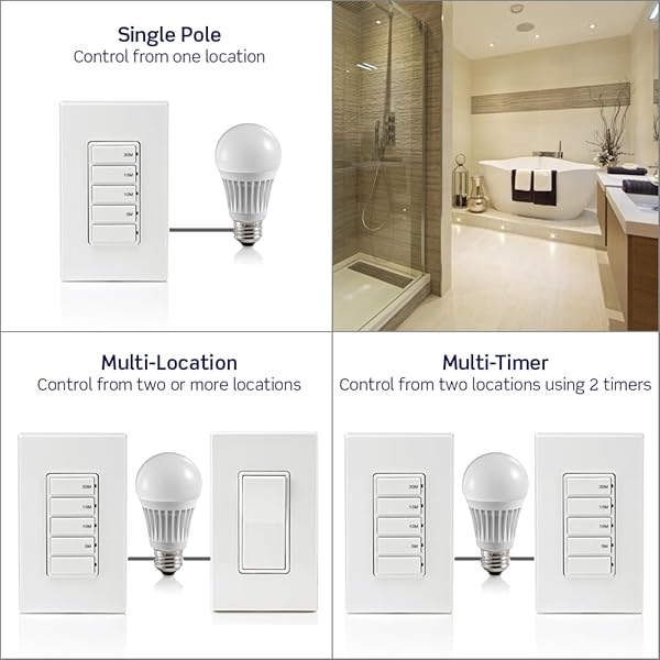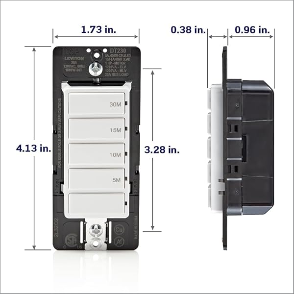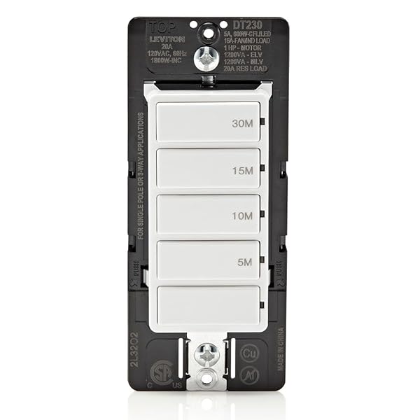 - Leviton Countdown Switch for bathroom household lights, 5-10-15-30 min, Neutral Wire Required, 20A, 1HP/16A Fan/Motor, Single Pole, Multi-Way or Multi-Timer, DT230-1LW, White with reliable performance and quality- CONVENIENT replace your current wall switch with a countdown timer to automate fan/motor and lights. Four preset time buttons to turn on and automatically turns off when time expires- EASY TO INSTALL shallow design easily fits in the wallbox. 600W LED/CFL, 1800W