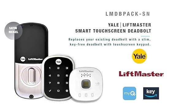 - Liftmaster myQ Key Free Smart Lock with Touchscreen, Deadbolt, in Satin Nickel with myQ Smart Garage Control (LMDBPACK-SN & 821LMC) offers reliable performance and quality- Smartphone Control Pair with included Lock Wi-Fi Bridge to securely lock, unlock and view door activity in the myQ App. Touchscreen Keypad Wakes with a touch and has backlit numbers that wont wear off
