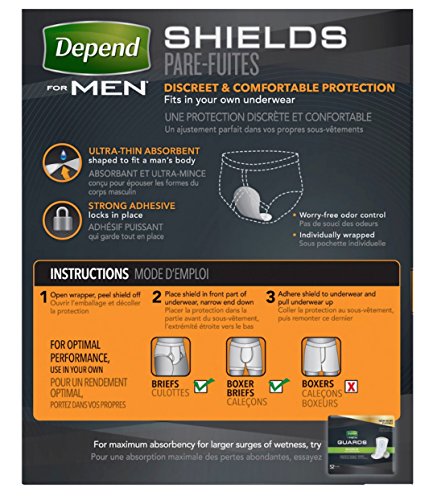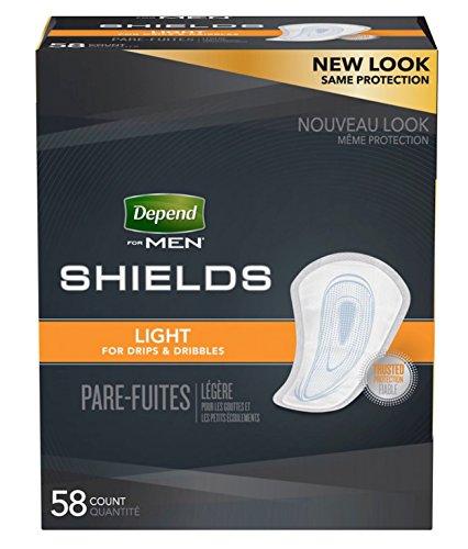 * DependsMen Incontinence Shields/Pads Light Absorbency - 1 Box: men deserve an incontinence pad designed specifically for their bodies with protection that fits their lifestyle * Depend Shields Incontinence Pads for Men provide discreet and comfortable protection made for a man * Depend Shields underwear liners have light incontinence absorbency for drips and dribbles of wetness * These incontinence pads for men are ultra-thin and absorbent for protection that is shaped to fit a mans body *