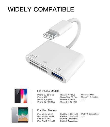 - Camera Micro SD TF Memory Card Reader Lightning Male to USB3.0 Female Adapter OTG Cable for Apple iPhone 11 12 mini max pro xs xr x se2 7 8plus Ipad air A Connector Flash Stick Drive Splitter provi...- 4 IN 1 CAMERA CONNECTION KITUpgraded Multi-function, compact and portable design, more powerful and easy to carry. With the lighting charging port, you will never worry about the power shortage whe...
