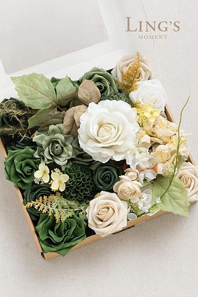 - Ling's moment Fake Flowers Box, Faux Artificial Greenery Stems Foam Roses Dahlia Silk Ranunculus Fabic Flower for Centerpieces Bouquet Wedding Vase Decorations, Emerald & Tawny Beige, Grand Combo with reliable performance and quality- SQUARE PACKAGING: Box size 11.22"D x 10.24"W x 2.56"H, comes with enough flowers to fuel your creativity, this square box can DIY a medium full enough centerpiece, or 4 small centerpieces.- REALISTIC LOOK: Choose high quality fabic flower and