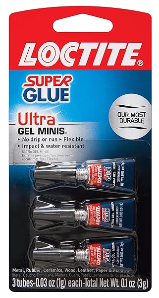- Loctite Super Glue Ultra Gel Minis, Clear, 0.03 fl oz Tube, 3 Pack - Superglue for Plastic, Wood, Metal, Crafts & Repair, Cyanoacrylate Adhesive Instant Glue, Quick Dry: reliable performance and quality- Rubber toughened formula- Gel formulation- No mess, no drip formula; Ideal for vertical applications- Dries transparent