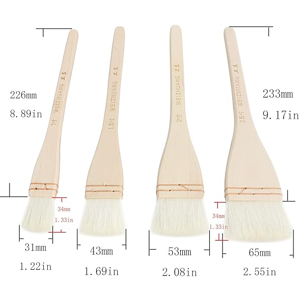 * Longdex Creative Mark Hake Paintbrush Set 4PCS Professional Soft White Goat Hair Stitch-Tied Brushes for Wash, Background Work,Watercolor and Ceramic Pottery: product size/weight: * 1 inch: 26x3x2.5cm/13g * 1.5 inch: 27x3.5x3cm/17g * 2 inches: 27x3.5x4cm/18.3g * 2.5 inch: 27x3.5x5cm/20.7g