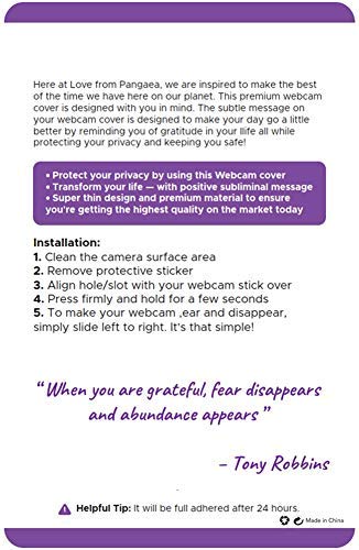 - Love from Pangaea Positive Affirmations Privacy Webcam Cover, 3 Pack Ultra Thin Slide for Laptop, Monitor, Mobile, Computer, Black offers reliable performance and quality- [Guard Your Privacy] Our Webcam Cover protects your personal privacy in an unobtrusive and good looking manner against possible video surveillance from hackers. Just use a finger to move the slider easily, open or close your privacy webcam any time, protect yourself