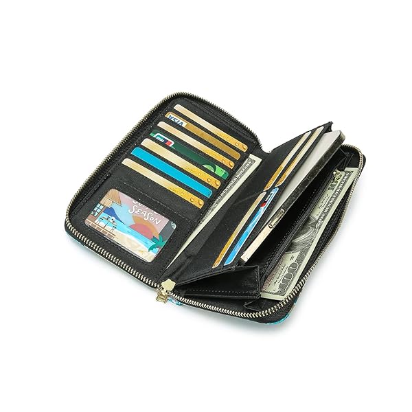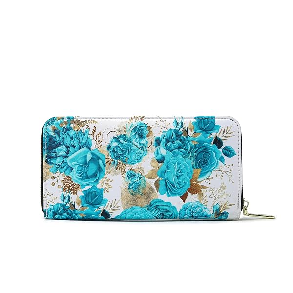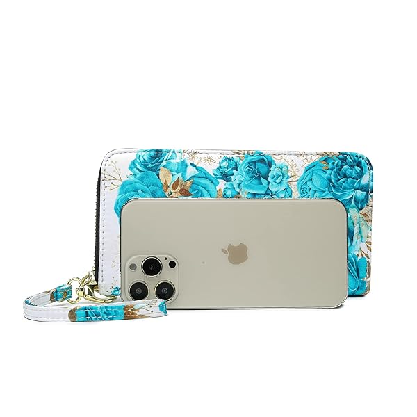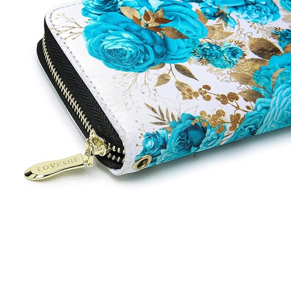 - LOVESHE Women's Wallet RFID Blocking Bohemian style Credit Card Zip Around Phone Clutch Large Travel Purse Wristlet Clutch Wallet Zipper Wallet For Women(CambridgeBlue-Flower) offers reliable performance and quality- Advanced RFID Blocking: Protects private information from unauthorized scans with proprietary blocking material- Spacious Design: Dimensions of 4.3W x 8"H x 1"D. Includes 4 cash/ticket slots, 1 zipper case, 13 card slots, and 1 window pocket."