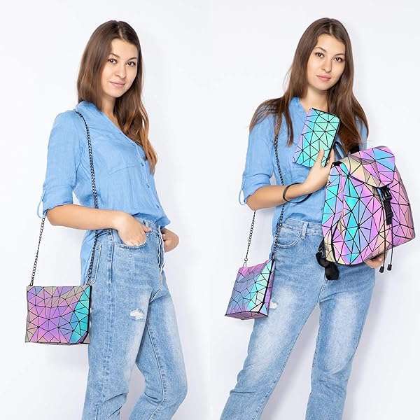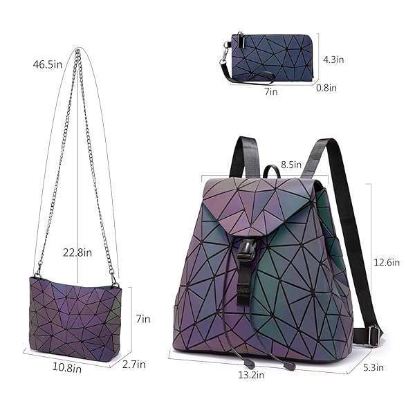 * LOVEVOOK Geometric Luminous Backpack for Women Holographic Reflective Purses Crossbody Bag Wallet: stylish and cool geometric design * The color changes with the light * Let you be full of personality * 3PCS combination package to meet all your daily needs * Backpack + Crossbody Bag + Wallet