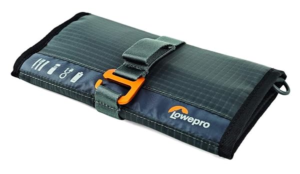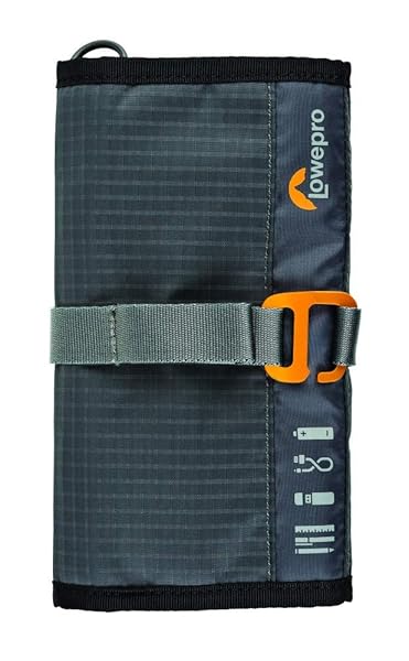 - Lowepro GearUp Wrap: Compact Travel Organizer for Phone Cables, Adapters, USB Memory Sticks and Small Devices offers reliable performance and quality- Dedicated padded slots with elastic webbing securely hold cords and USB chargers- Elastic web holds stylus or pen- Clear interior pockets for small items- Anodized aluminum clasp secures Wrap closed