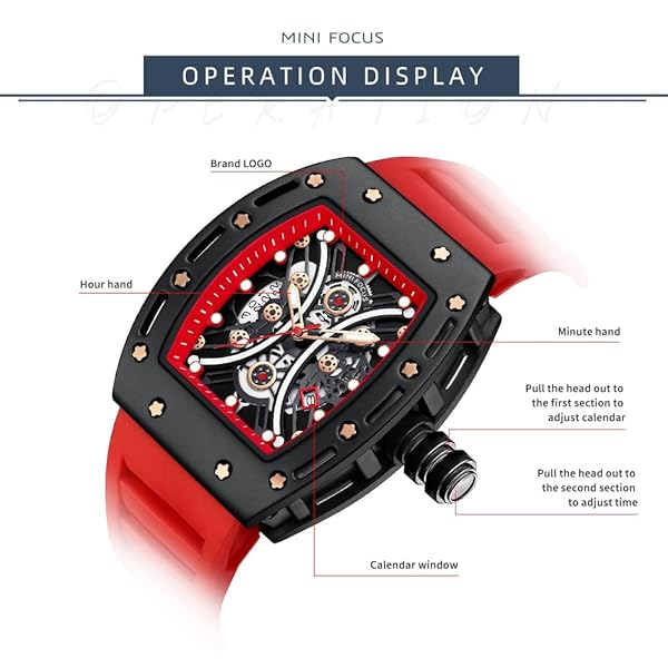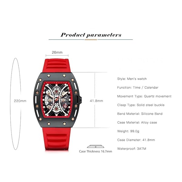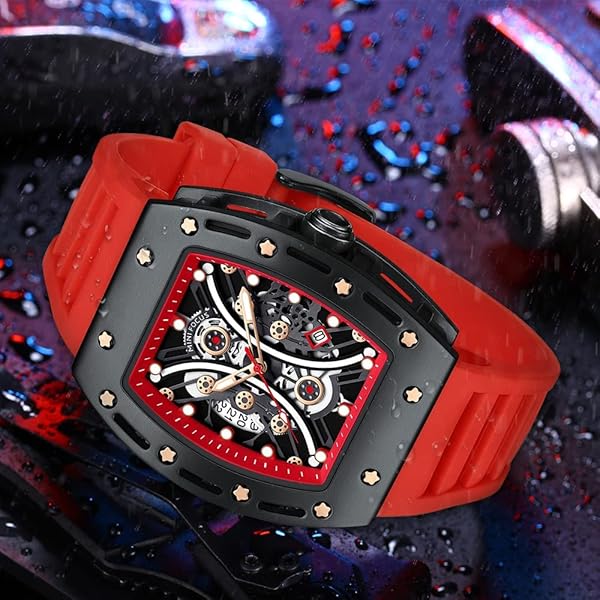 - Watches for Men Luxury Skeleton Tonneau Watch for Men Waterproof Adjustable Silicone Strap Steampunk Style Chronograph Calendar Date Business Luminous Cool Large Square Face Wristwatch, Red, provid...- Mens Watches:Elegant fashion style,fashion bling design and chronograph sport style,exactly for a men's watch.This iced out diamond classic business and sport style watch will be greatly suitable f...