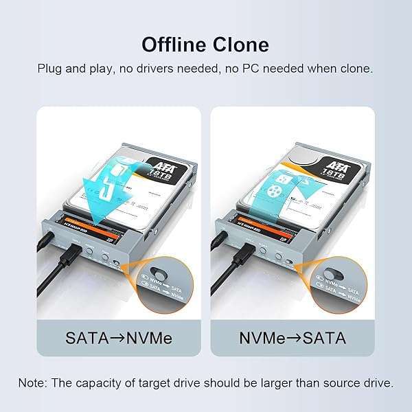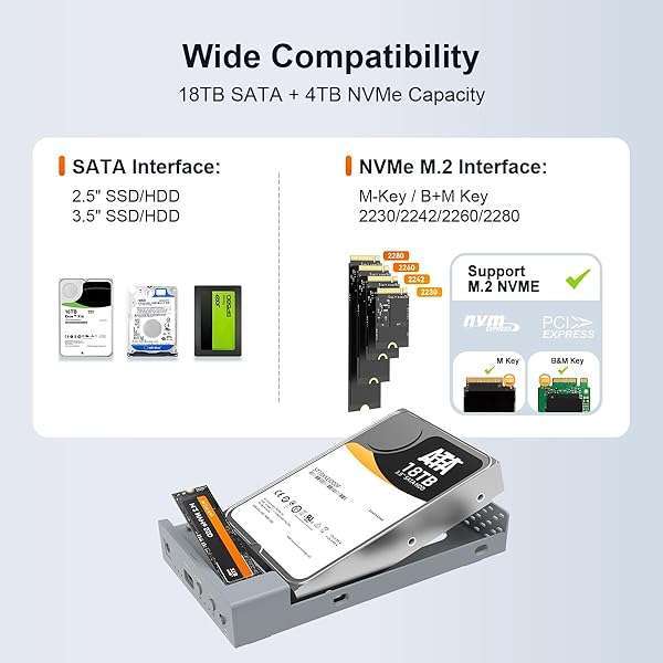 * MAIWO USB C Docking Station for M.2 PCIe NVMe + 2.5 3.5 Inch SATA SSD HDD with Offline Clone, Clone HDD to NVMe SSD, USB 3.2 GEN 2 10Gbps External Hard Drive Enclosure: read & writethis dual bay cloner supports m.2 nvme b-key/b+m key ssd in size 2230/2242/2260/2280mm and 2.5/3.5 inch sata ssd/hdd * It can access data of two types of drives at the same time * (DO NOT SUPPORT M.2 SATA SSD) * 10Gbps Transfer SpeedThis dual bay hard drive reader equips with JMS581D chipset and USB3.2 Gen2 output